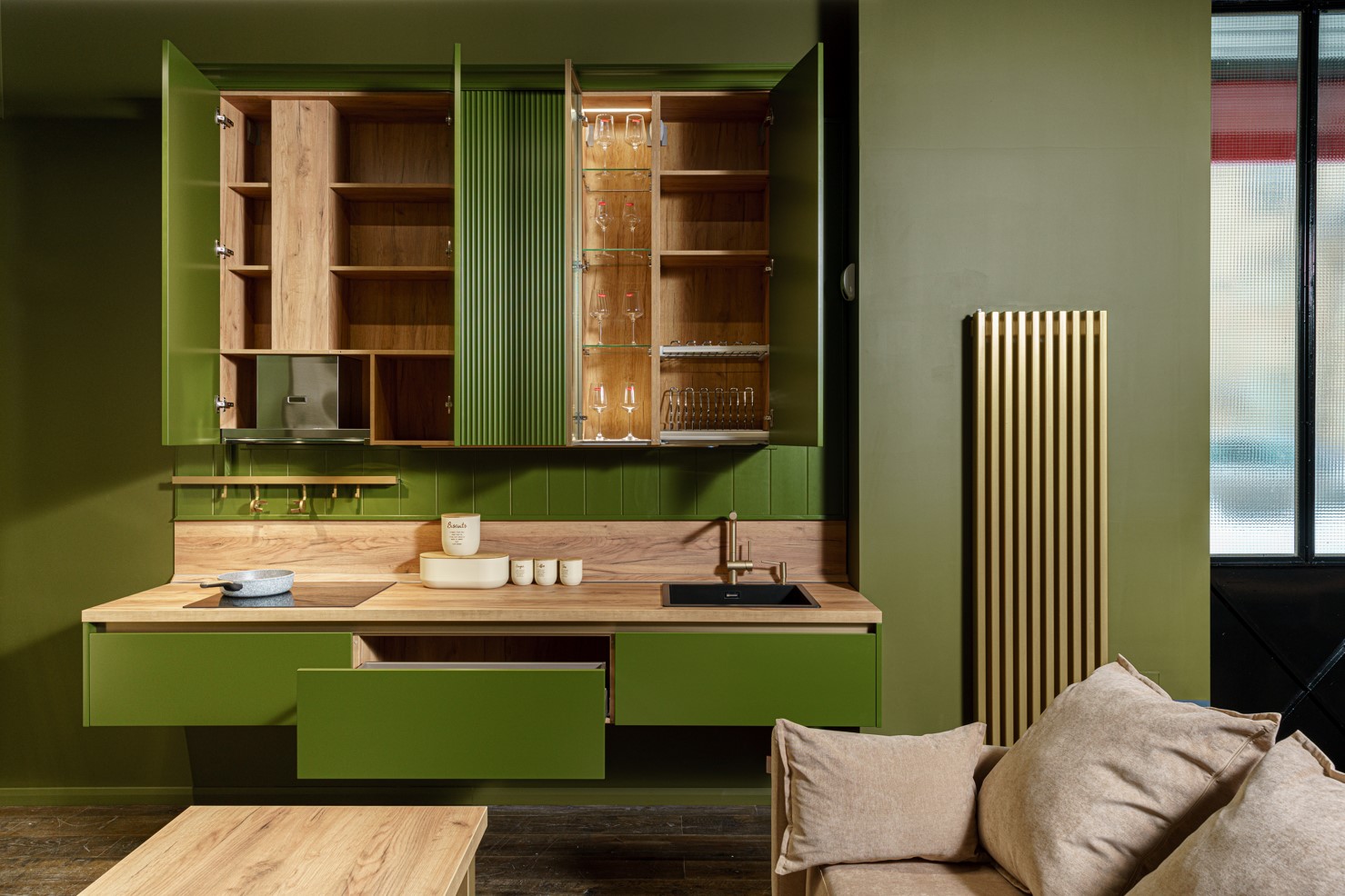 Две топ-модели воплотились в яркую неоклассическую кухню. Фасады Allure изготовлены из МДФ, фасады Borgo — из натурального итальянского массива. Они покрыты матовой эмалью цвета NCS S 5540-G60Y. Столешница выполнена из ДСП оттенка «дуб крафт золотой». «Золотая» отделка и декор добавляют пространству особый шик. Секции-витрины с рифленым стеклом Мору в тонких рамах оборудованы атмосферной подсветкой.