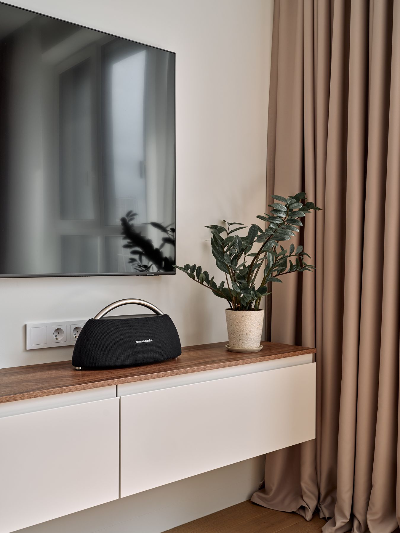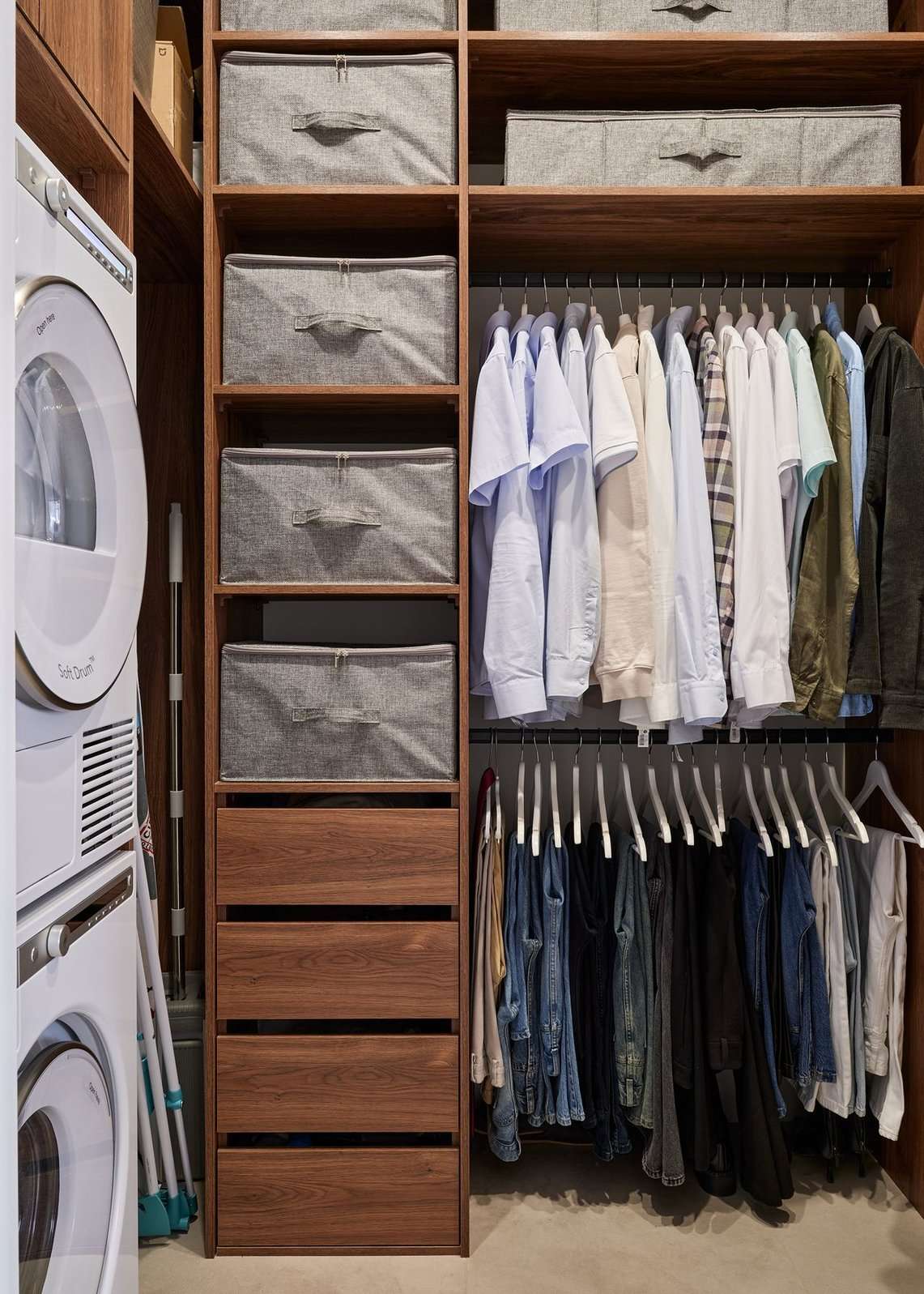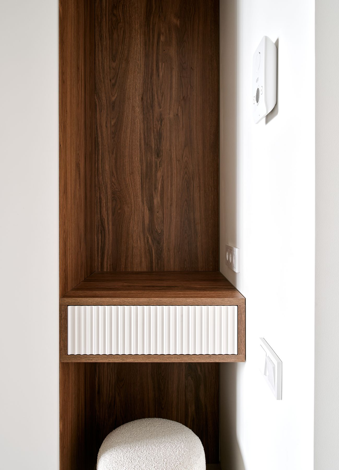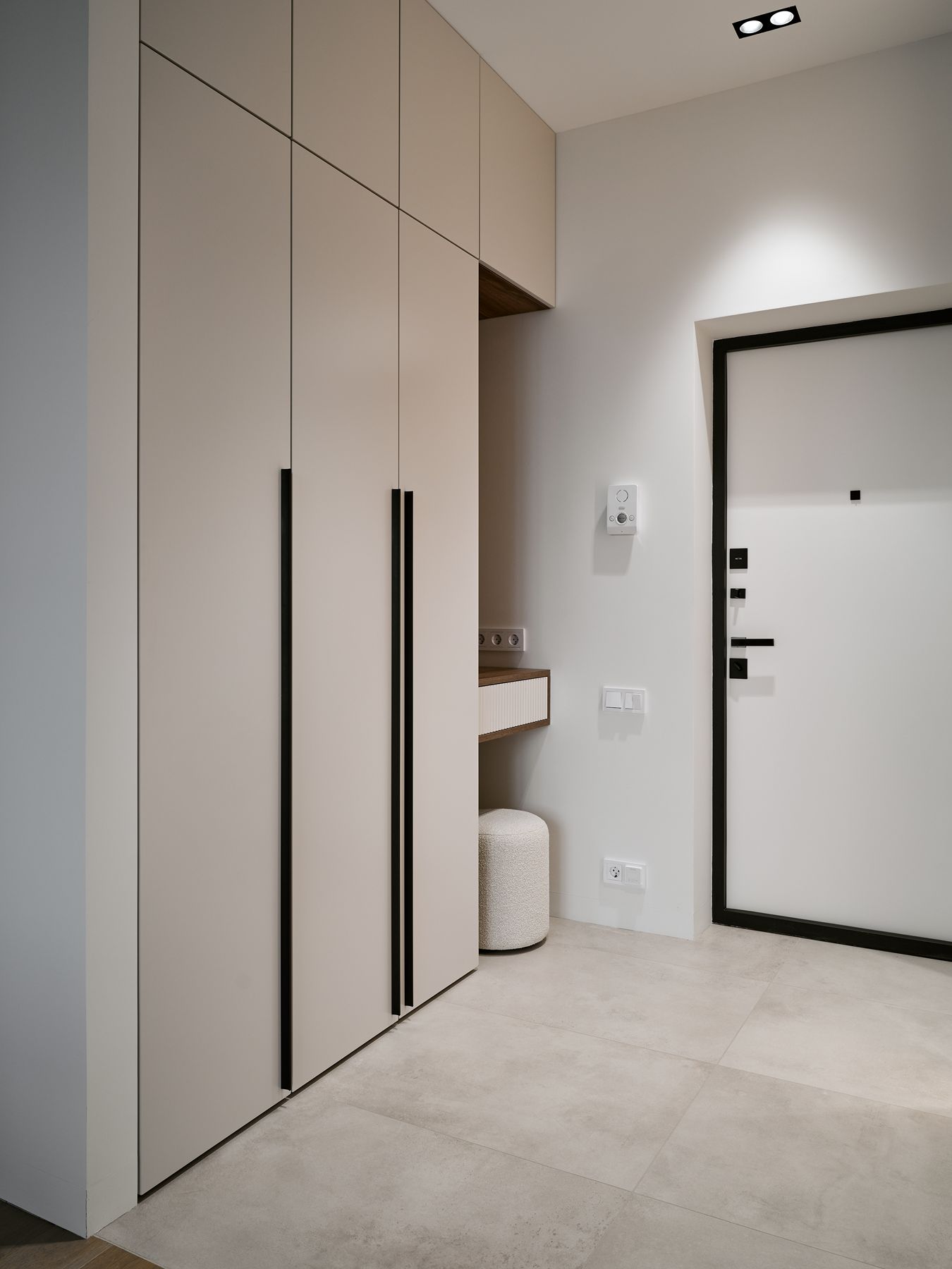 Оформление остальной части квартиры также выполнено в пастельных оттенках, но с использованием теплого древесного оттенка. Гостиная оснащена ТВ-зоной с навесной консолью Jazz и шкафом Mix 22. В прихожей имеется распашной шкаф и маленькая консоль в углублении стены, предназначенная для ключей и сумочек. Антресоли можно использовать для хранения сезонных вещей. В отдельной гардеробной расположена постирочная.