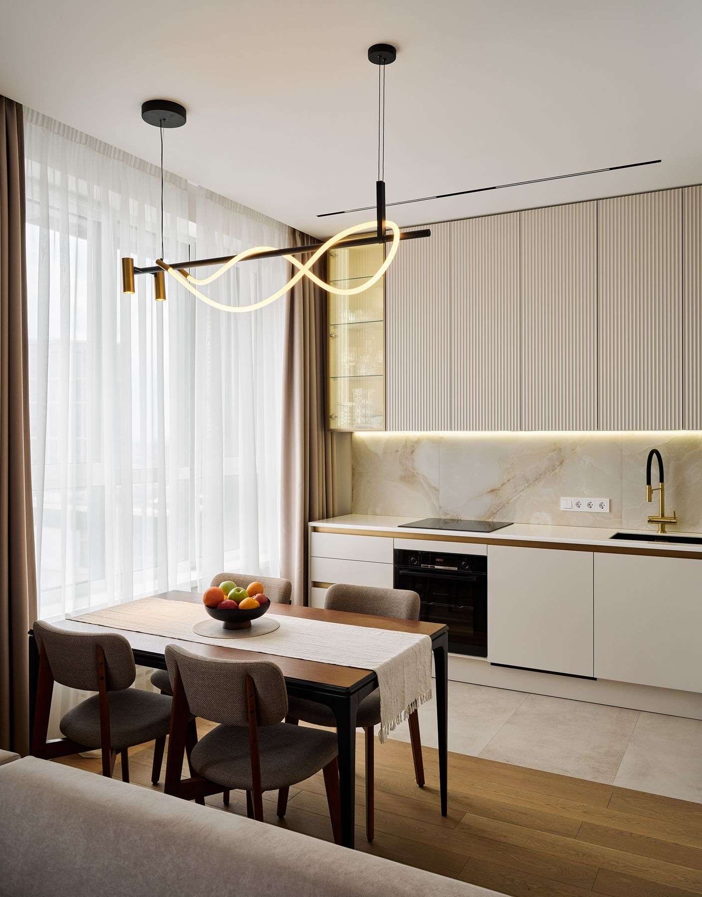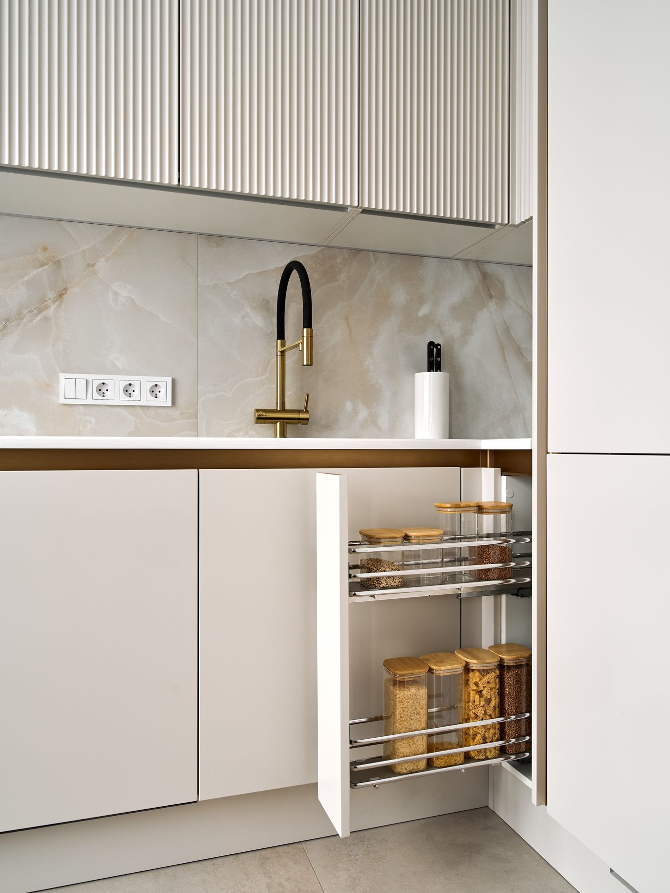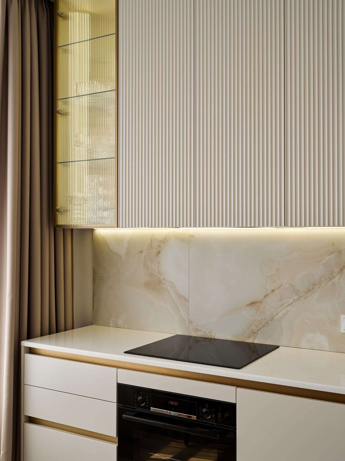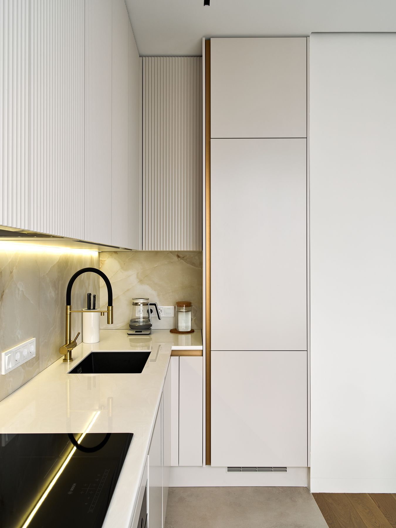 О проектеОписаниеХозяйка интерьера Ирина обратилась в студию с желанием создать максимально простую и минималистичную кухню. Но на встрече с дизайнером она была так очарована фактурой рифленых фасадов и изысканным золотым декором, что решила внести в проект кухни изменения.