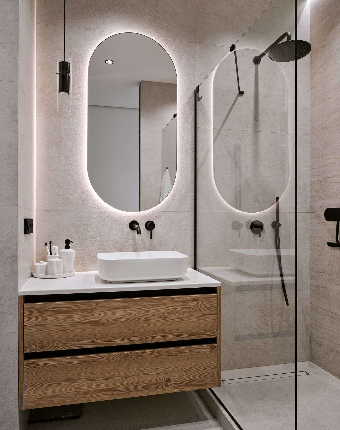 Санузел оснащен тумбой Mix 22 с белоснежной столешницей из искусственного камня и оригинальной раковиной. Ниша с инсталляцией дополнена шкафчиком и открытой полкой с подсветкой.